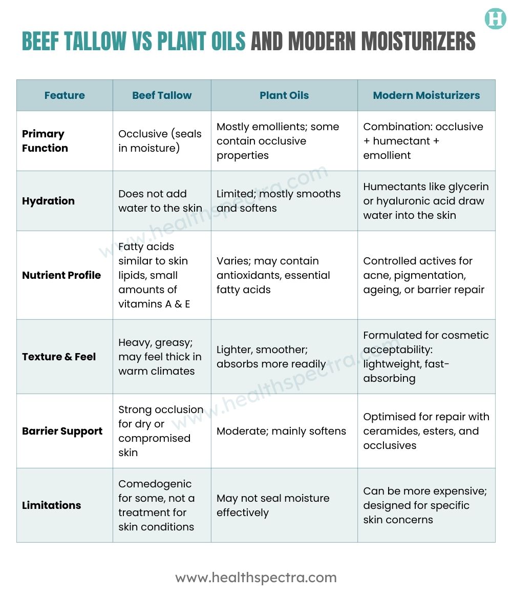 Beef tallow has regained attention in skincare for its barrier-supporting properties, but it’s important to understand how it compares to plant oils and modern moisturizers.