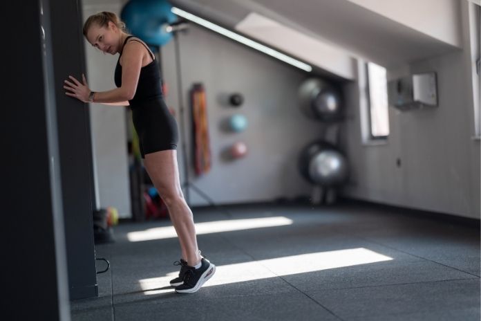 Place your hands on a wall and step one foot back with the heel flat on the floor. Keep your back leg straight and hips square. Hold for 30 seconds, then switch sides.