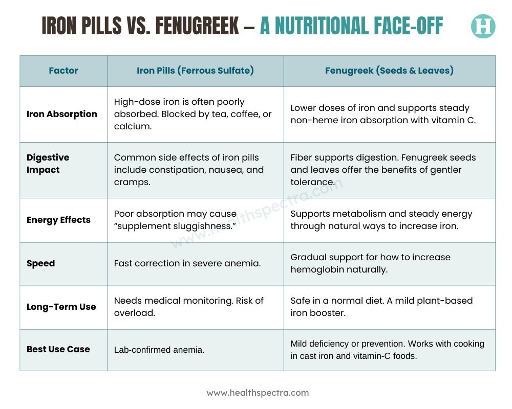 In this article, we will compare fenugreek for iron with traditional iron supplements to see which works better for energy and digestion. It explains common iron pill side effects, why supplement sluggishness happens, and how food-based tips can help.