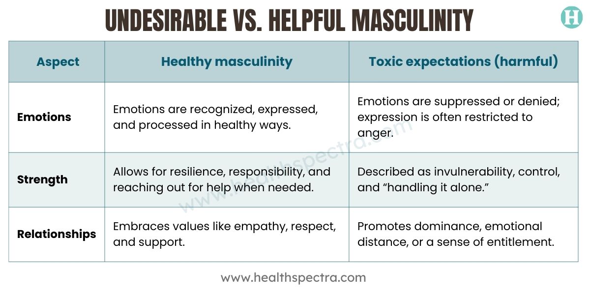 Healthier forms of masculinity encompass a normal spectrum of feelings and relationships, while toxic forms of masculinity penalize men for being human.