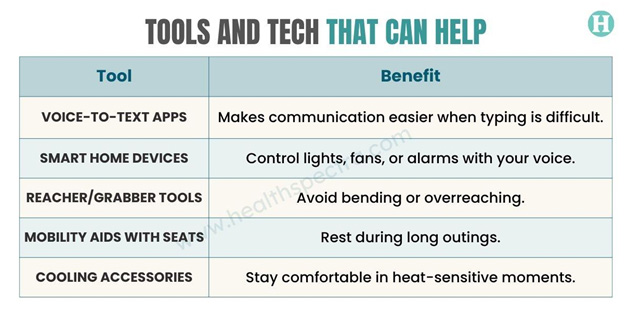 - Beat the Heat: Many people with MS are heat-sensitive. Use tools like cooling vests, neck wraps, or portable fans when temperatures rise. Avoid prolonged exposure to sunlight or hot showers, as overheating can trigger or worsen fatigue.