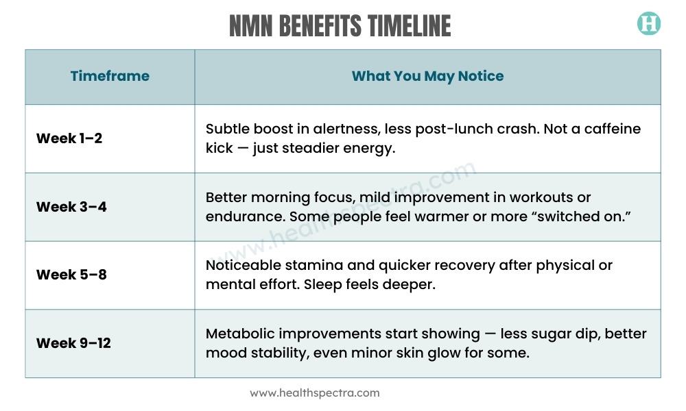 Here’s a realistic timeline people experience when starting NMN (based on human data and anecdotal reports):