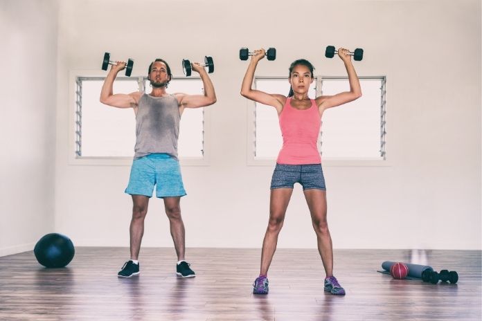 To do the overhead press, stand or sit with dumbbells held at shoulder level. Press the weights up until your arms are fully overhead. Briefly pause at the top, then lower under control. Don’t arch your back and keep your core tightened throughout the set.