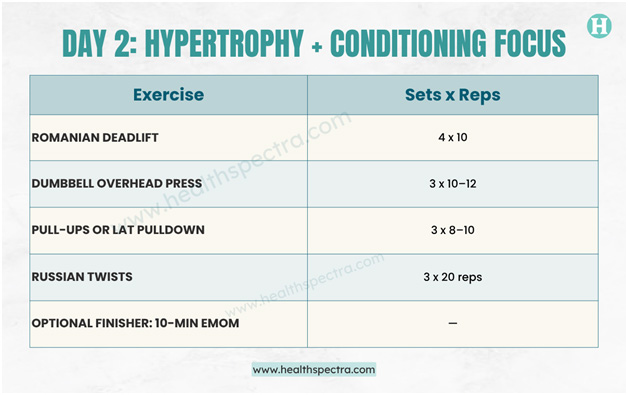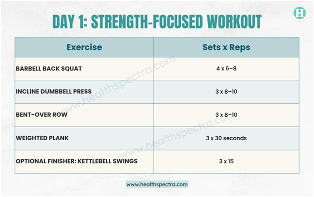 - Equipment: Barbell, dumbbells, resistance machines, or bodyweight equivalents