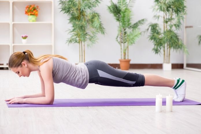 Begin in a solid bodyweight plank, then add a small weight plate to your upper back after you can easily hold for 30 seconds with elbows under your shoulders, body in a straight line. Don’t sag hips or pike up.