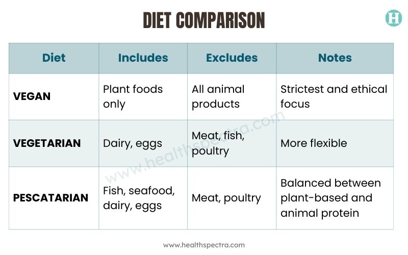 Many vegetarians see this as a balanced compromise between ethics, nutrition, and practicality when comparing the vegan vs vegetarian vs pescatarian diet.