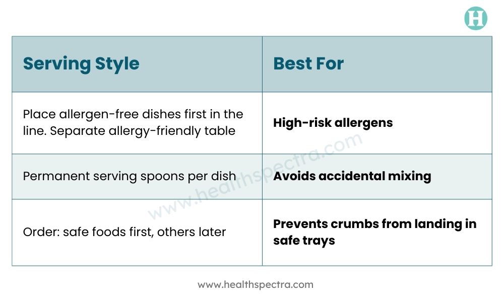 Even if cooking is perfect, serving can go wrong. One helpful practice is to let guests with allergies serve themselves first. Here’s a simple layout idea: