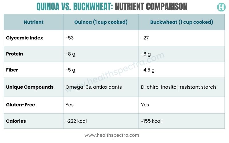 This is where the buckwheat vs quinoa comparison becomes particularly relevant: quinoa moderates glucose with protein content, whereas buckwheat directly slows glucose absorption and enhances insulin signaling.