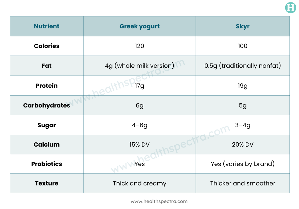 Skyr contains a slightly higher concentration of calcium, which is very essential for maintaining healthy teeth and bones as well as proper nerve function.