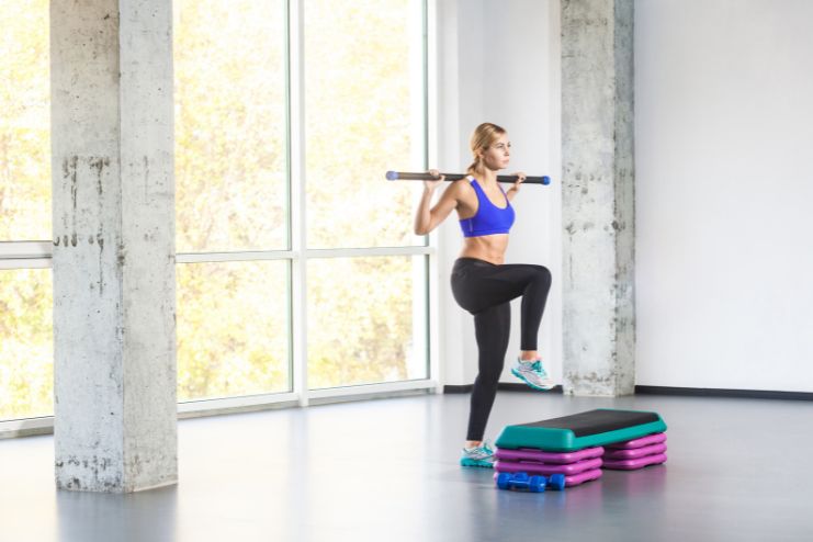 Step-ups are simple yet effective squat alternatives that strengthen your leg muscles without straining your knees. You’ll need a sturdy chair or box that’s the appropriate height for comfortable stepping.