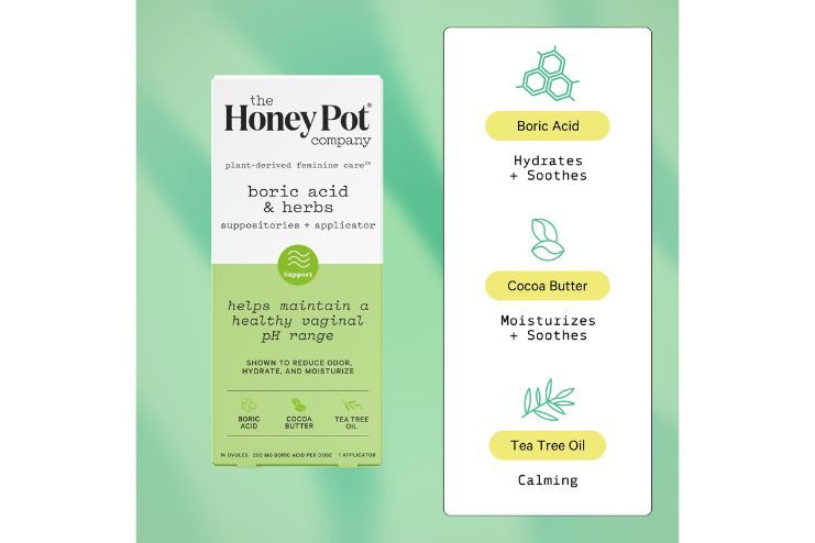 Boric acid is a compound formed by combining boron, oxygen, and hydrogen. When incorporated into a suppository, boric acid can help maintain vaginal pH levels and manage unpleasant odors.
