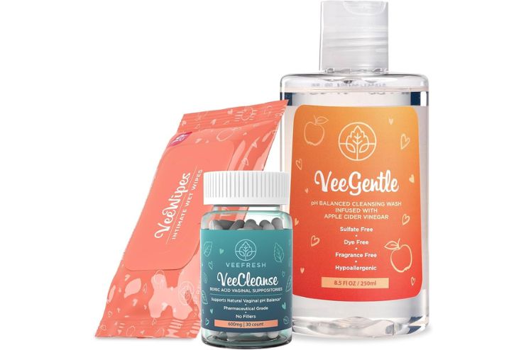 This comprehensive package includes VeeFresh boric acid vaginal suppositories, VeeGentle feminine pH wash infused with ACV, and VeeWipes feminine hygiene wipes for optimal female health.