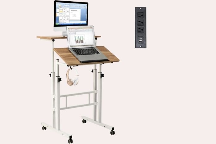 We recommend Hadulcet Adjustable Standing Computer Desk a height-adjustable mobile workstation with built-in power outlets, wheels, and spacious desktop for ergonomic sitting or standing use. It improves posture and productivity.