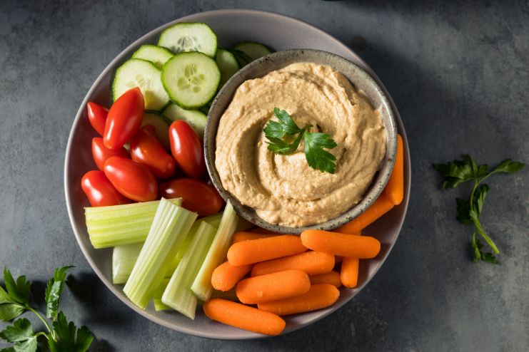 Vegetable sticks with hummus are a crunchy, vibrant, and utterly irresistible snack that is filling and healthy. Hummus is a tasty and creamy Middle Eastern dish made from chickpeas.