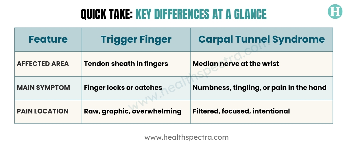 The primary distinction lies in the nature of the symptoms, such as trigger finger involves mechanical locking of the finger, whereas carpal tunnel syndrome is characterized by nerve-related sensations.