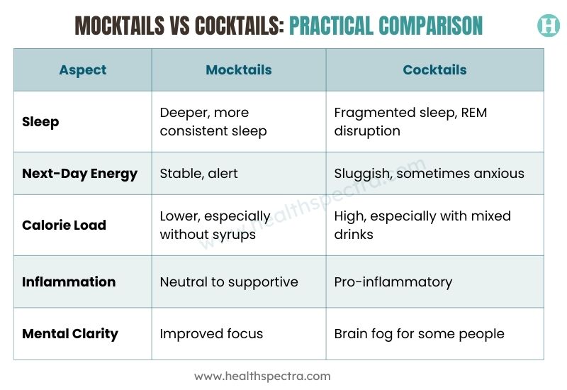 Choosing between mocktails and cocktails isn’t just about alcohol content; it affects sleep, energy, inflammation, and overall well-being. While cocktails can be enjoyable socially, mocktails offer a way to maintain the ritual of drinking without the drawbacks alcohol can bring. Here’s a practical side-by-side look at the differences: