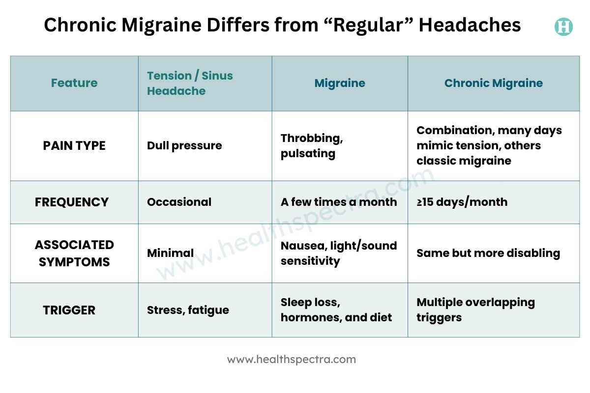 - It differs substantially from ordinary headaches in frequency, neurological features, and long-term impact.