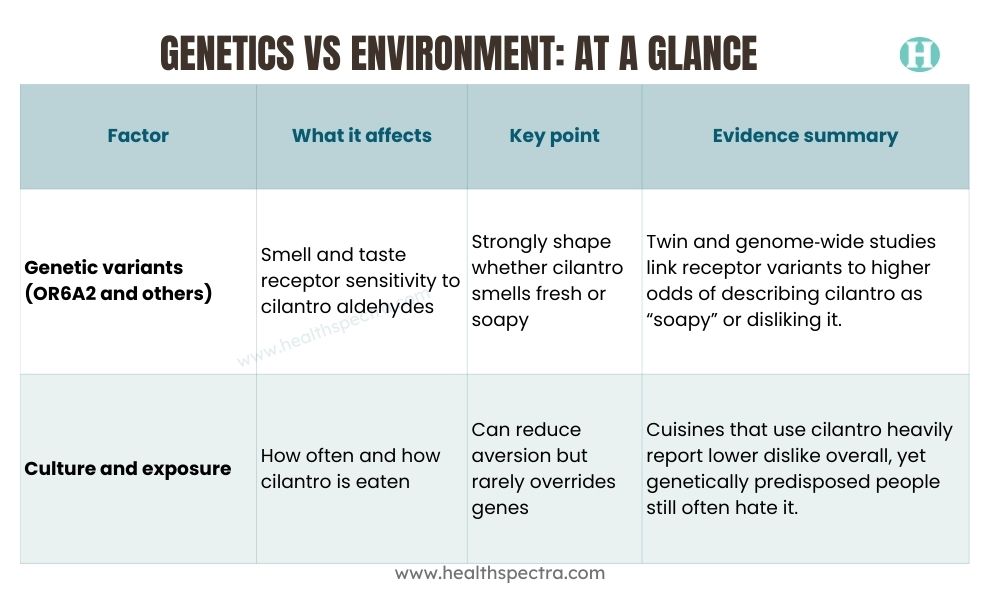 Twin studies reinforce this genetic role, since identical twins show more agreement in cilantro preference than fraternal twins, even when they share similar environments.