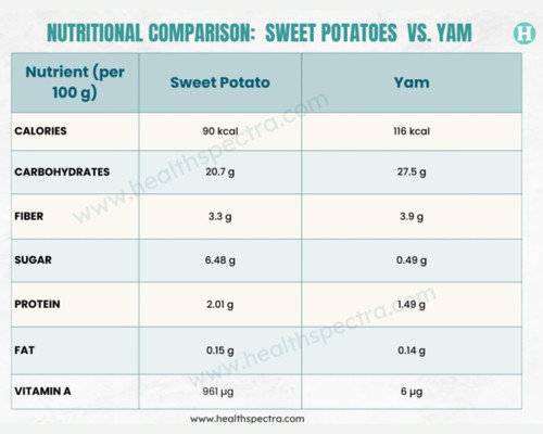 Nutritional comparison of sweet potato vs yam (per 100 g serving):