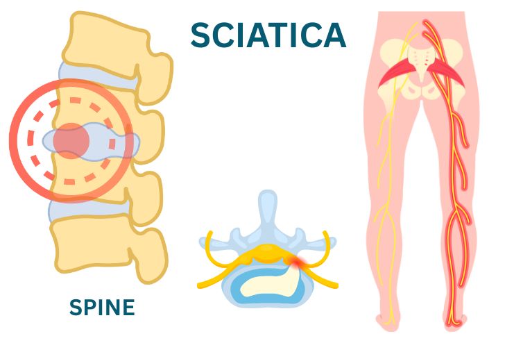 Sciatica typically results from compression or irritation of the sciatic nerve due to various underlying spinal conditions: