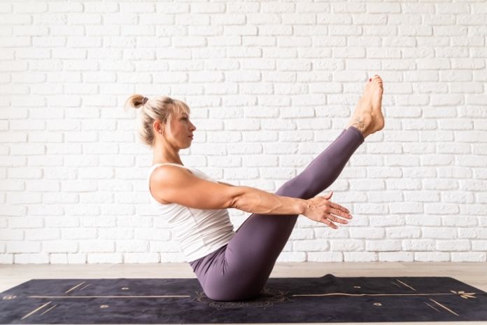 Naukasana, or Boat Pose, is a strong yoga pose that tones the abdominal muscles, improves balance, and strengthens the core by creating a “V” shape with the body.